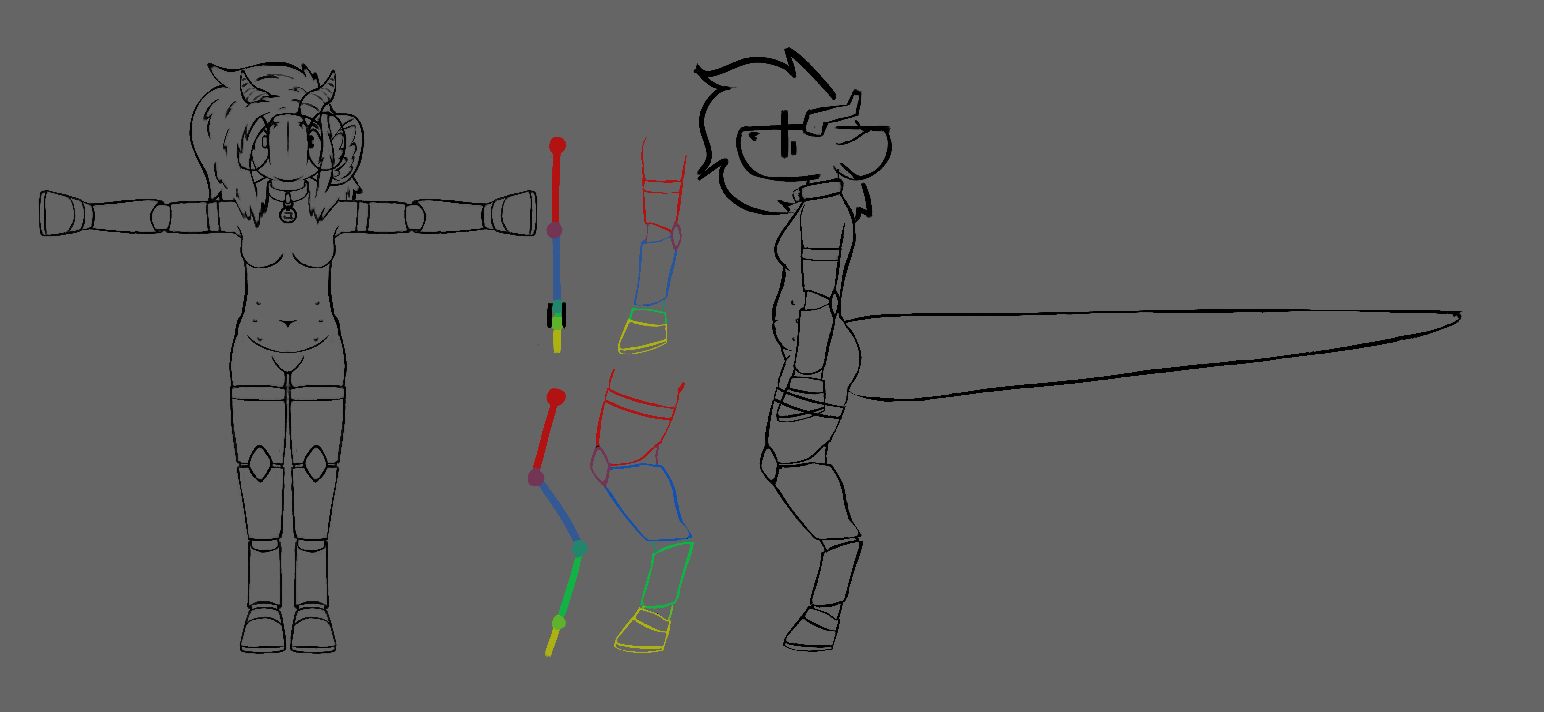blender has a feature that does the weight painting for you automatically when pairing the skeleton to the mesh. this works okay for humanoid models with organic anatomy - you still have to do a lot of work manually adjusting areas like the shoulders or hips, but it gives you a decent head start. but if you're working with a (partially) mechanical model, one with non-human anatomy like digitigrade legs, a snout and a tail, using automatic weights does more harm than good. i watched tutorial after tutorial, desperately trying to find ones that actually attempt to explain the basic concepts instead of giving you a hack to do it in 5 minutes that doesn't actually help or teach you anything. i kept trying to make the automatic weights work, adjusting and adjusting, resetting and starting from scratch every time i realized my approach wasn't going to work. it felt hopeless, and unfortunately for this one step none of my friends had any helpful advice - you just kind of have to get a feel for it.