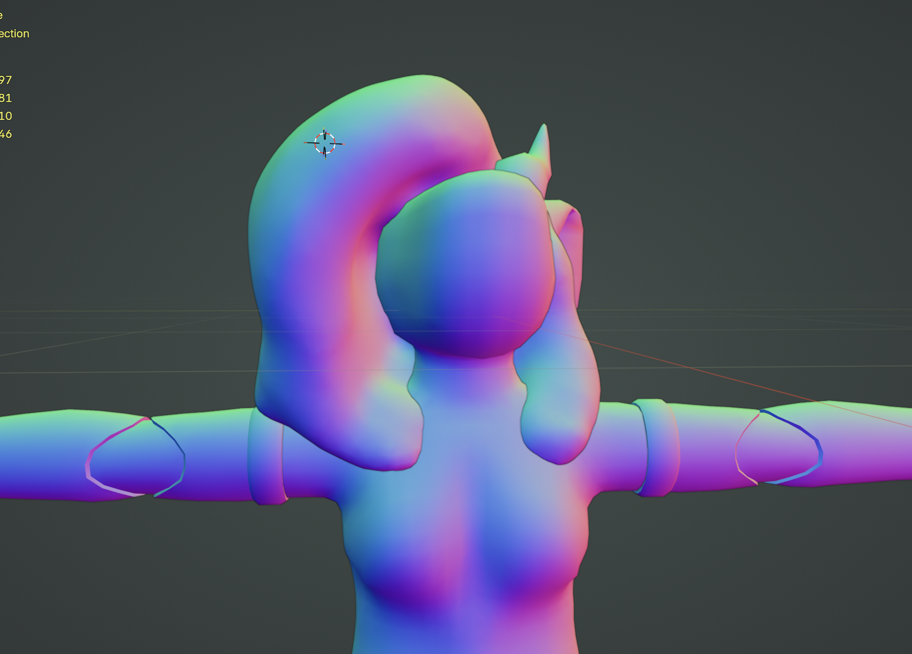 avi, one of the friends i was hanging out with in vr, offered to show me how to set up my blender workspace so i can easily switch back and forth between a set pose and a t-pose preview, and i took her up on that. this was very helpful, as you wanna be weight painting while your character is in a neutral pose, but you can't really see whether the weight painting is working well unless the character is posed differently. this setup allowed me to experiment / iterate quickly. i gave up on trying to use any sort of automatic weights and all, i gave up on tutorials, and i started weight painting from scratch. selecting each bone, assigning it the vertices that it seemed like it should be able to affect based on my knowledge of anatomy. i focused on getting individual parts right before i'd move onto the next, and i started out with the easier ones before moving onto the tough parts like shoulders and hair. first i blocked out the general shape of weights for each bone, previewed it, then adjusted parts that didn't quite look right, previewed that, then adjusted again. this loop let me slowly crawl my way towards weights that looked okay, which was all i wanted.