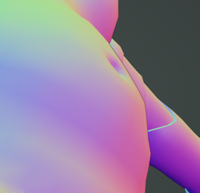 i decided to be a little fancy and make a "normal" texture too. i only really use it for the horns, the front of the snout and the belly nipples. basically what this allows you to do is fake extra detail that isn't actually there by affecting how the light reacts with these areas.