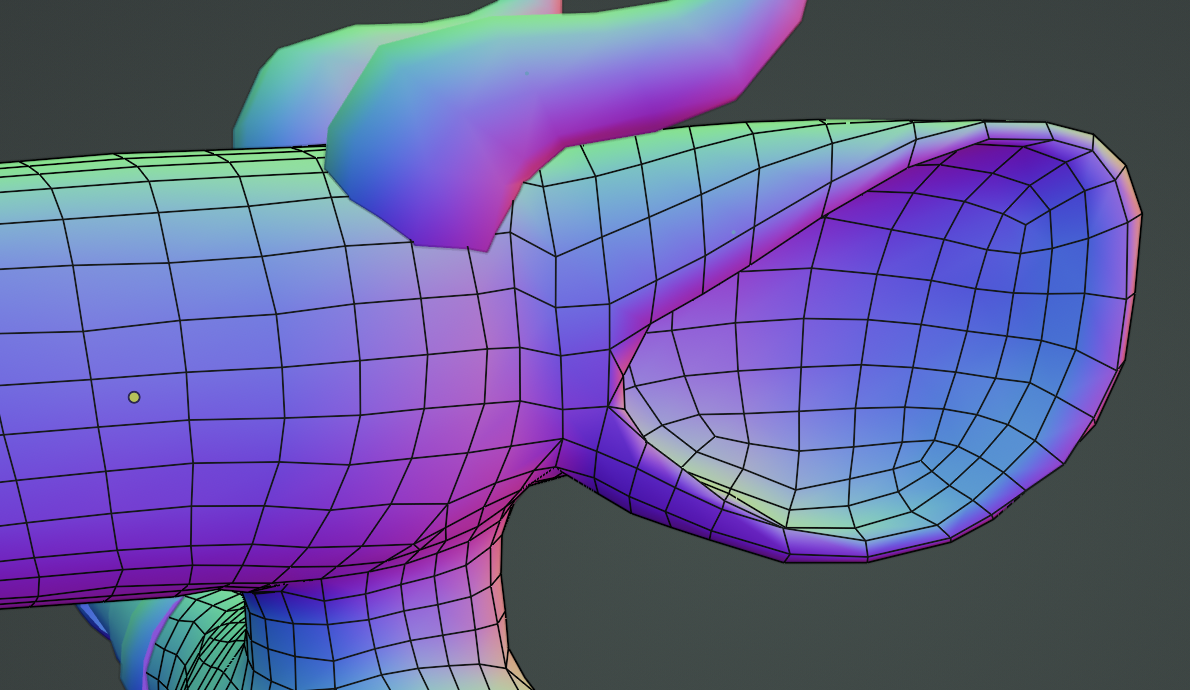 after that, i decided to redo the topology of the ears using a process called "retopology". what that involves is basically making a whole new mesh on top of the existing one, except with better geometry. here, compare:
