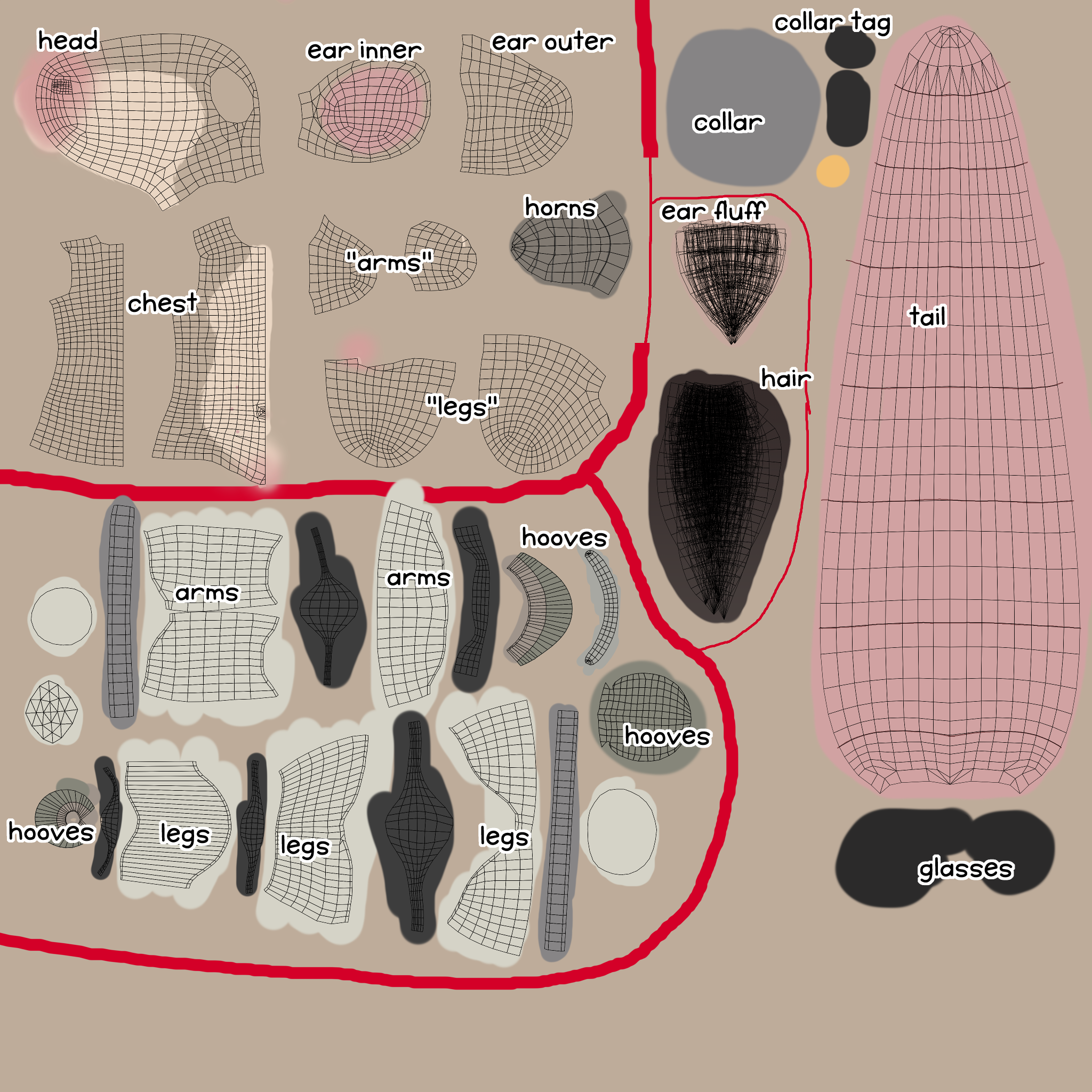 we're now 4 months into the project, and the next step is UV unwrapping. what this is is basically taking every part of your model and deciding where on the texture image it'll go. you mark the seams where the individual pieces of the texture will part, then "unwrap", then carefully position everything how you want it. i don't really have pictures of the process because there's not much to take pictures of, but i can show you how things ended up laid out on the final texture!