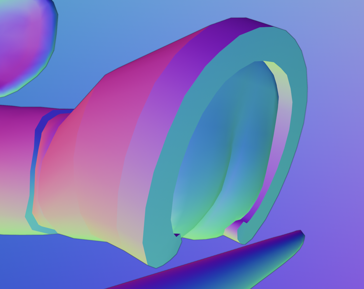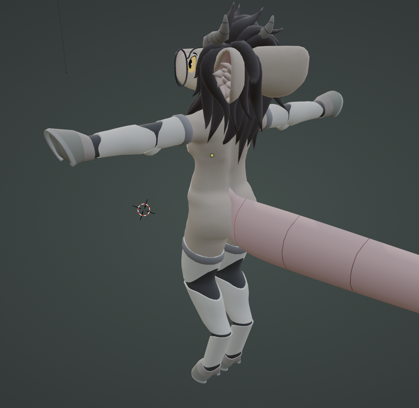 i also modeled the tail at some point, it's basically just a cylinder that gets narrower towards the end. i later squished it a bit to better resemble a tail shape, but its geometry might be the simplest part of the model. the bit that was really difficult to get right was the bit where it connects to the body. the tail is very large and wide, so figuring out a seamless way to connect it to the main body without it looking weird or obscuring the butt too much took a while, but i'm really happy with what i came up with