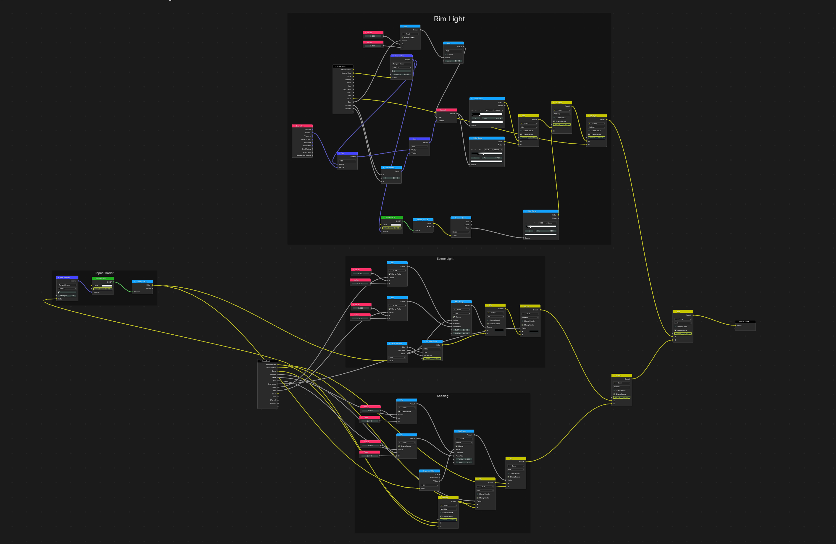 for the vrchat version, i just used poiyomi toon shader - a free, pre-made and easily configurable cel shader. i basically just slapped it into the avatar and configured the settings how i liked, i didn't have to do anything crazy or complicated. i figured surely, there must be something like that for blender, right?