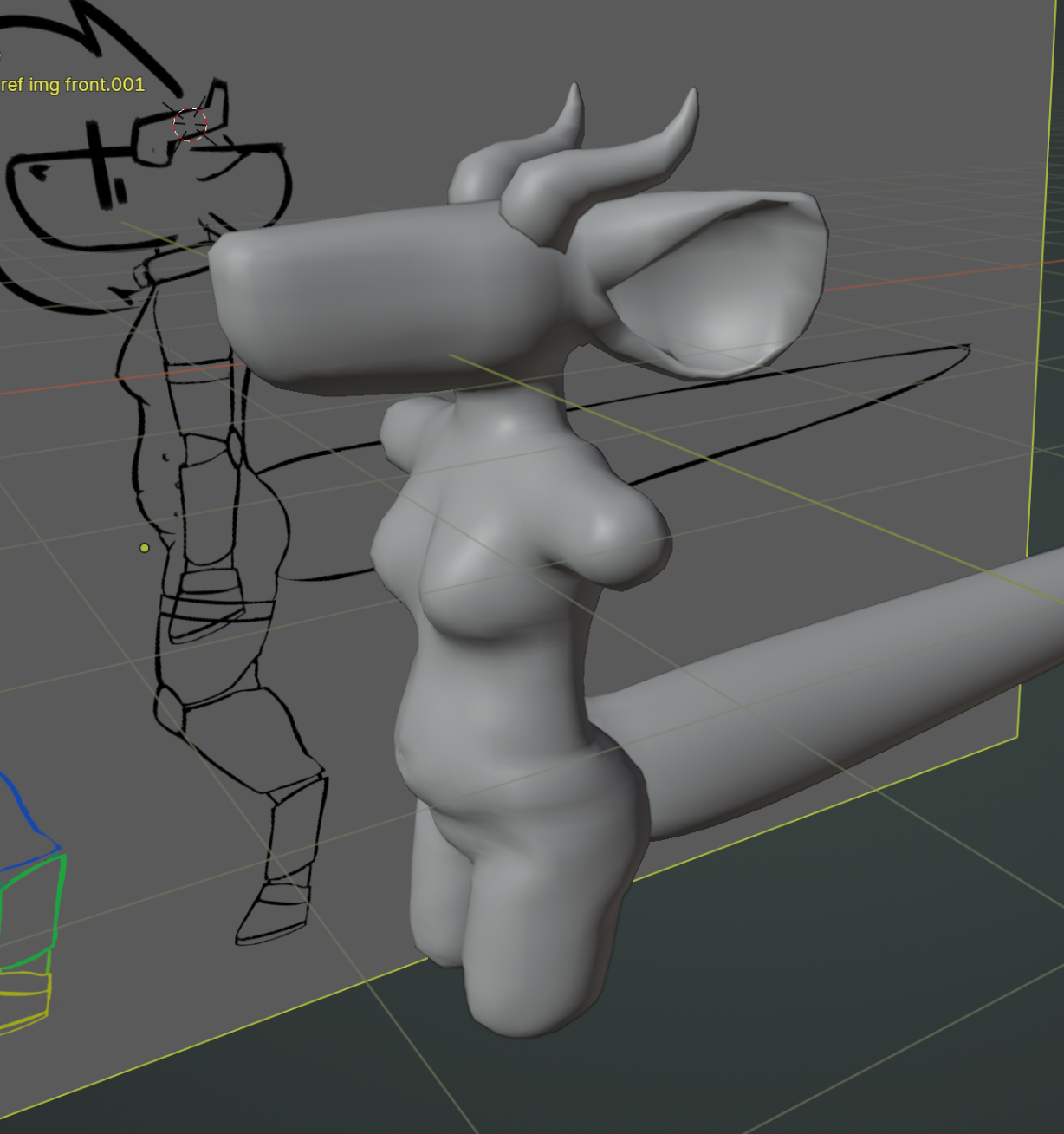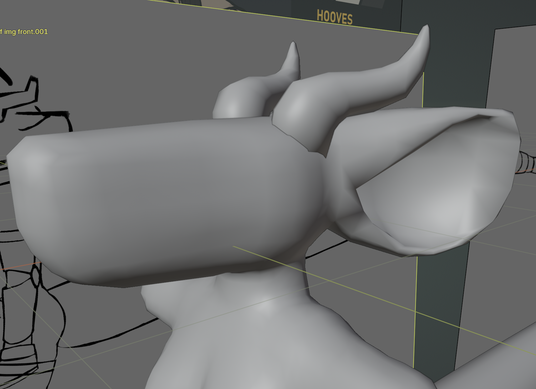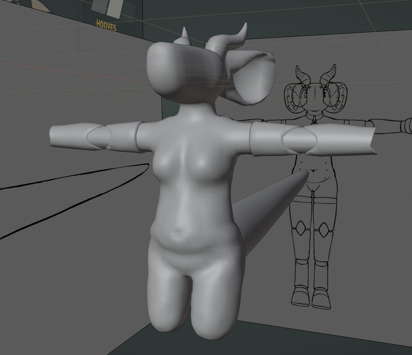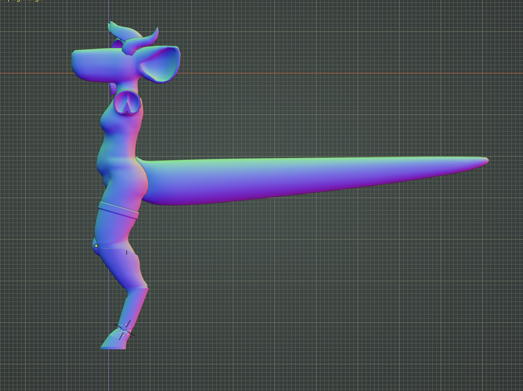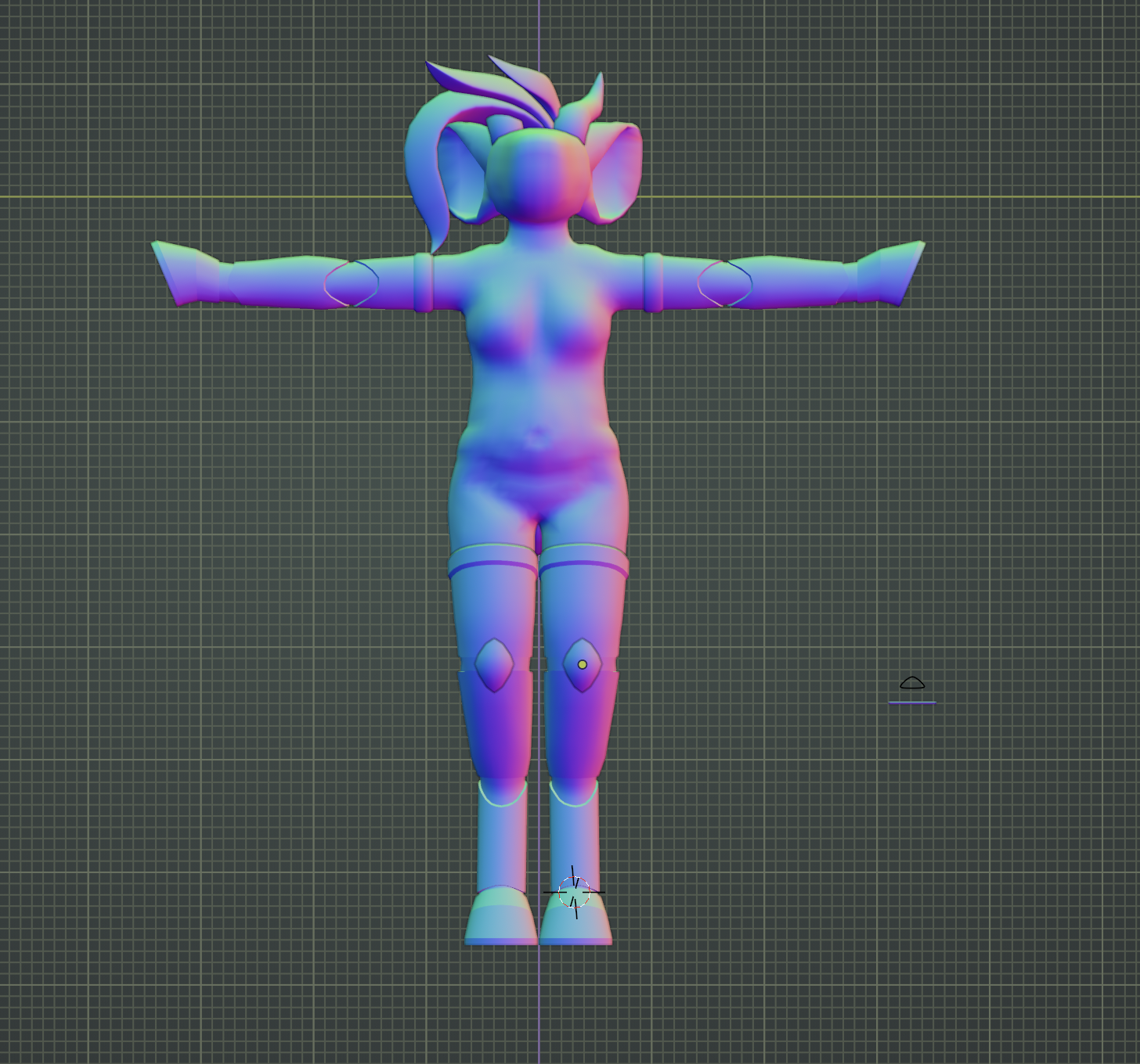the legs came next, being modeled in the same way the arms were. the knee caps were copied from the arms and just stretched out a bit to fit. the hooves were also copied; it's important to me for reasons that all her hooves be the exact same shape and size, so i ended up having to adjust the legs a little bit to be able to fit the hooves next to each other without clipping.