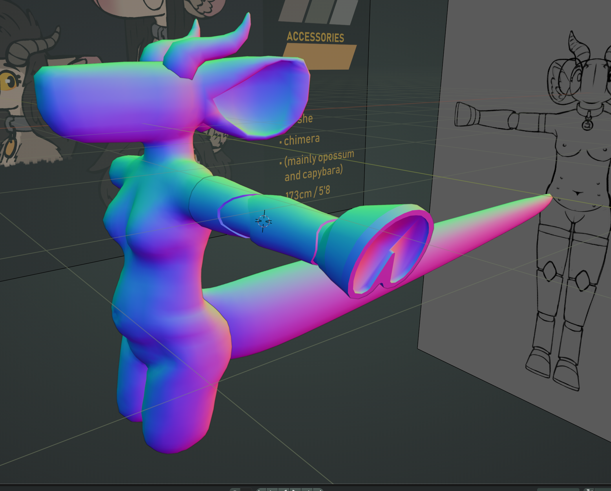 i started trying to get back into VR. i had fallen into a bit of a slump, isolating myself from my friends, not wanting to interact with anyone other than my owner - i could tell it wasn't good for me, and how much it was affecting my mental health. i find this kind of socializing very difficult, but i figured it'd be helpful to try joining my friends in VR again. it was really awkward at first, i couldn't help but feel like i was infringing on a space i wasn't wanted in, despite nobody doing anything to make me feel that way. it was tough at first, but as i kept joining every week it started getting easier, i started enjoying myself around others, i was having fun! the avatar i was using at the time was a possum base that i retextured to kind of look like my sona. it was a fun design, but it didn't quite feel like me. and as i started being more comfortable being myself around others, i wanted to look more like me, too. i remembered the model that sat on my solid state drive collecting digital dust, and i made it a goal in my mind to make it into an avatar within the next week, ready in time for the next meet i'd be joining.